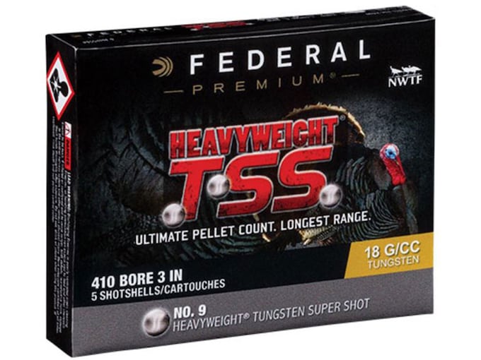 Kill gobblers at longer distances than ever before with Federal HEAVYWEIGHT TSS. Its payloads of HEAVYWEIGHT Tungsten Super Shot provide the highest pellet counts possible. The tungsten-alloy material’s 18 gm/cc density is 22 percent higher than standard tungsten and 56 percent more than lead. The result is the most energy and highest velocities at extreme range. FeaturtesHEAVYWEIGHT TSS payload with advanced buffering materialExtremely high pellet counts22 percent denser material than standard tungsten; 56 percent denser than leadRoll crimp and clear card wad keeps buffering material in placeFull-length wads prevent direct contact of the extra-hard pellets and the bore, protecting the barrelA portion of the proceeds are donated to the National Wild Turkey Federation