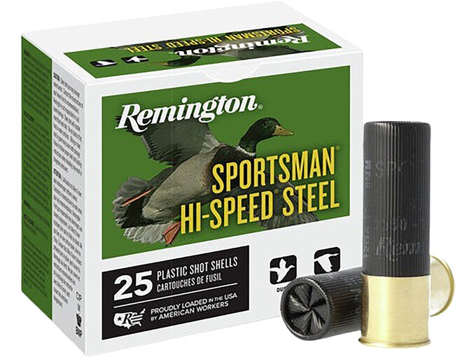 Being a leader in both the firearms and ammunition industry Remington knows how important it is to have the highest quality ammunition available to make your firearm perform to its fullest potential. Remington uses the highest quality components to make each of their shotshells perform to the highest potential. Used worldwide by hunters and top target shooters it is easy to see why Remington shotshells are the preferred shell. Remington Sportsman Hi-Speed Steel offers all the dependability and performance you would expect from Remington ammunition without breaking the bank. Sportsman Hi-Speed Steel’s sealed primer, high quality steel shot, and consistent muzzle velocities combine to provide reliability in adverse weather, while delivering exceptional pattern density and retained energy. An economical, high-speed steel load that is ideal for short-range high-volume shooting during early duck seasons, or over decoys. Sportsman Hi-Speed Steel works equally as well in upland situations that require the use of non-toxic shotshell.FeaturesNon-toxic steelExcellent pattern densityConsistent velocity
