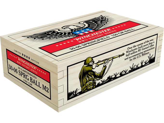 Winchester pays honor to the anniversary of World War II with its Victory Series ammunition, specially packaged in collector’s cartons and wood boxes. All ammunition as part of the series will also include period correct load specifications. This ammunition is also loaded using Lake City cases with LC 22 headstamps. Lake City was the primary manufacturer of 30-06 during WWII. This ammunition is new production, non-corrosive, in boxer-primed, reloadable brass cases. FeaturesLimited EditionCollectible wooden boxLake City Shell Cases with LC 22 headstamps